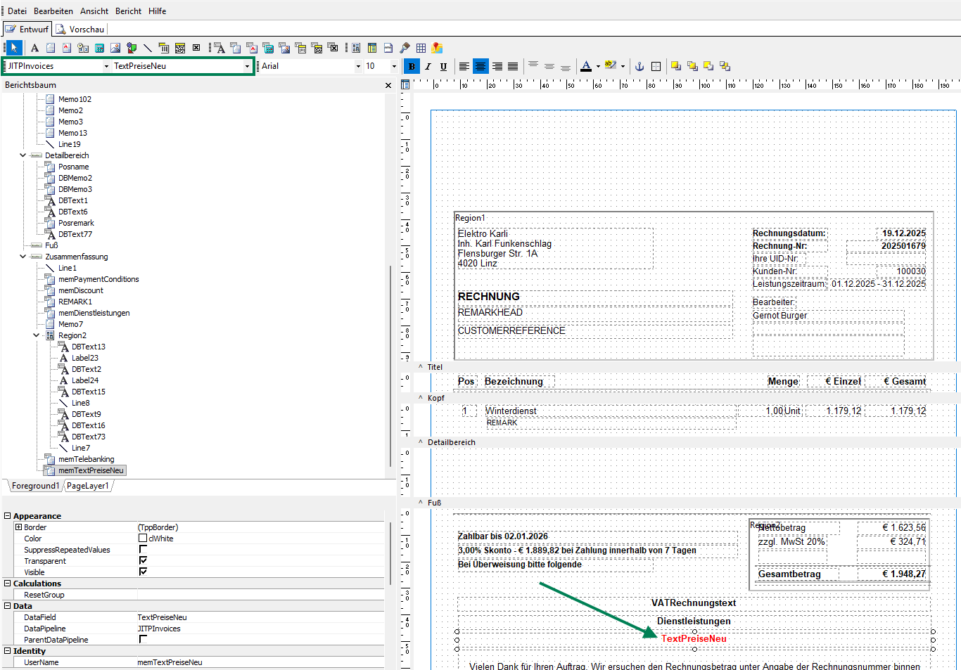 Im ReportBuilder kann über JITPInvoices.TextPreiseNeu gesteuert werden, an welcher Stelle der Infotext für die Preiserhöhung angedruckt werden soll: