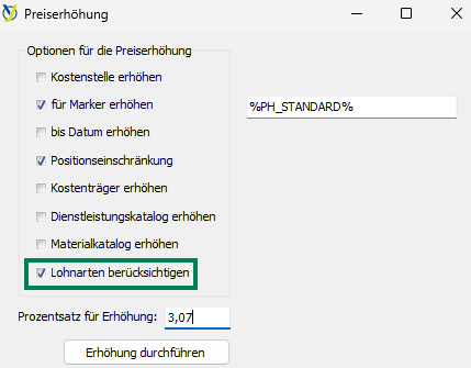 Bei der Preiserhöhung selbst kann man über eine neue Checkbox steuern, ob die Prozentsätze aus den Lohnart-Einstellungen berücksichtigt werden sollen: